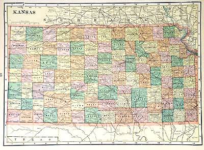 This detailed map was produced for Crams 1895 “Universal Atlas – Geographical, Astronomical and Historical.” In 1869, the George F. Cram Company was born, and the Cram name quickly became synonymous with accuracy and innovation. This map shows Kansas. Counties are distinguished by color. Other details include the names of and counties, important cities, major roads, hills, rivers, mountains, and lakes.