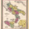 This map of the Kingdom of Naples or The Two Sicilies with an inset map of the environs of Naples was published by Thomas, Cowperthwait and Co., in 1854. Country regions, cities, towns, bodies of water, and topographical features are illustrated on this map. Original hand coloring in muted pastels and Cowperthwaits signature sage and pink border make this map a standout from other maps made during this time. ‘