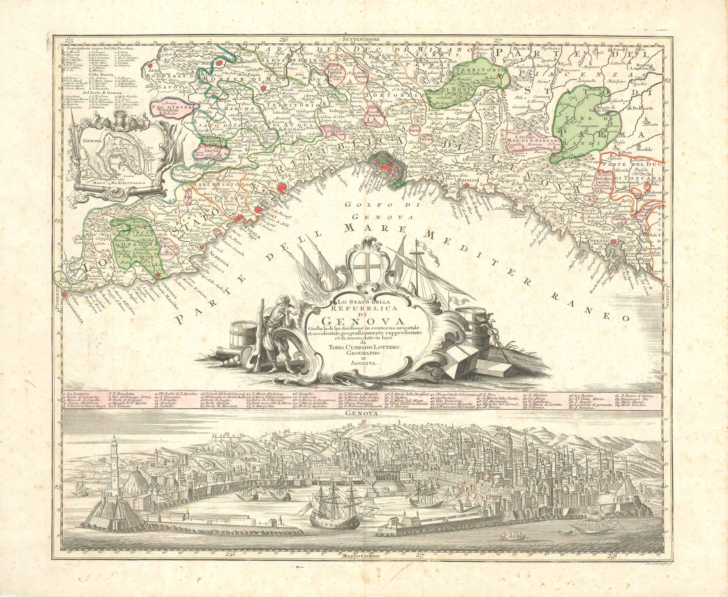 The Lo Stato della Repubblica di Genova is a richly detailed 18th-century map created by German cartographer Tobias Conrad Lotter, published around 1760 in Augsburg. This copperplate engraving, measuring approximately 19×22.5 inches, offers a comprehensive depiction of the Republic of Genoa, capturing both its geographical expanse and urban intricacies. The map illustrates the coastal stretch of the Republic of Genoa, extending from Ventimiglia to La Spezia, highlighting the region’s topography and settlements. An ornate central cartouche presents the map’s title, while an additional cartouche in the upper left contains a detailed plan of Genoa’s fortifications, reflecting the city’s strategic significance. Below the main map, a striking panoramic view of Genoa from the sea is featured, showcasing the city’s architecture and bustling harbor, accompanied by a numbered key identifying 64 notable structures and locations. This map not only serves as a geographical representation but also as a testament to the cartographic artistry of the 18th century. Lotter, who succeeded his father-in-law Matthäus Seutter, continued the tradition of producing highly decorative maps with vivid coloring and intricate details.