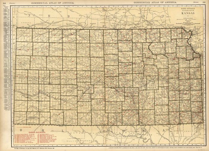 This map of Kansas was produced by Rand McNally and Co. as part of its Commercial Atlas of America. The detail shown on each map is exceptional because of the map size. These maps were intended to be used by business for shipping, etc. Roads, railroads, and rivers are clearly shown. There is more detail on these maps than any others during this time period.