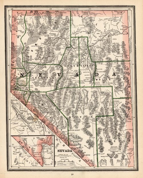 This detailed map of Nevada was printed in the “Peoples Family Atlas of the World,” published in 1887. This map shows a great deal of useful information, including lakes, rivers and railroad lines.