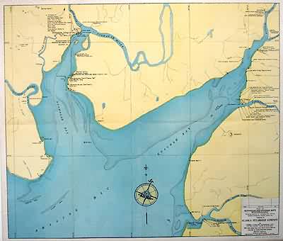 This large, fully colored map of Nushagak and Kvichak Bays in Western Alaska was made in 1946 by the Hubbell & Waller Engineering Corp. for the Alaska Steamship Company. The locations of villages, post offices, fish canneries, stores and hotels are identified.