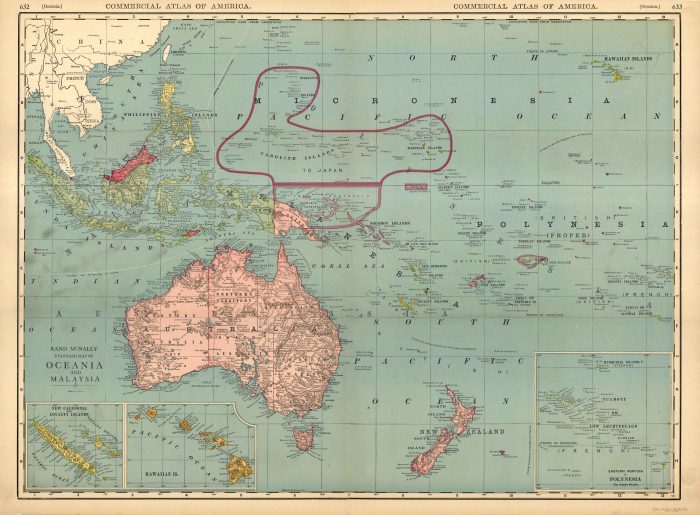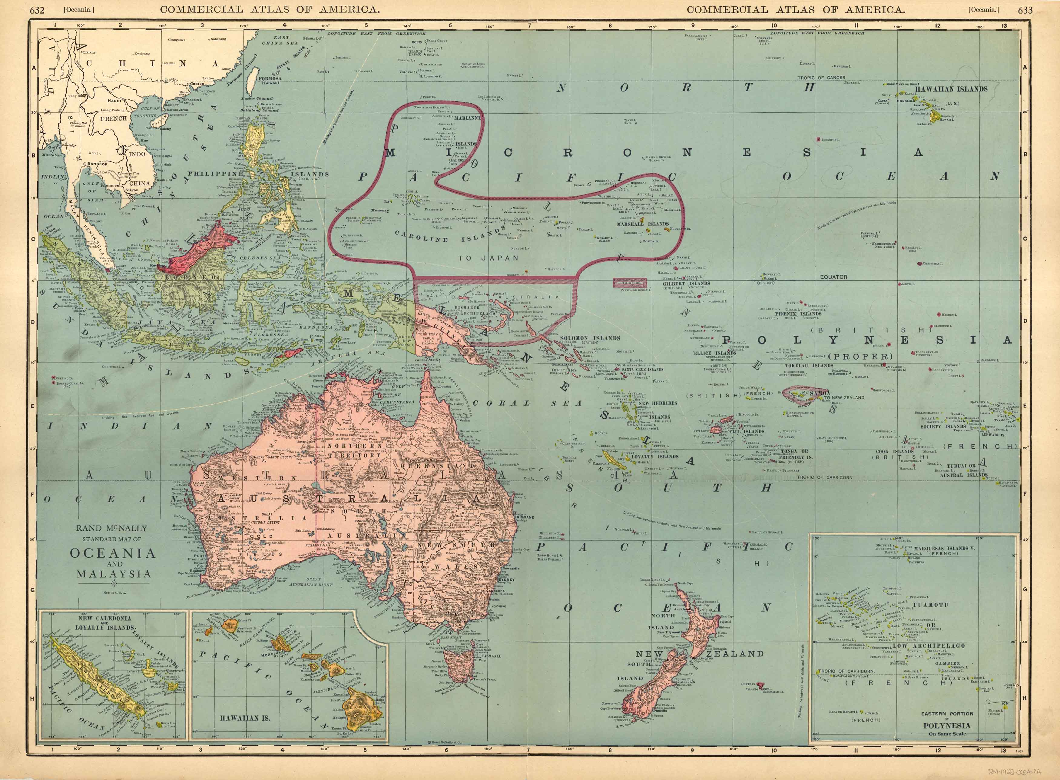 This map of Oceania was produced by Rand McNally and Co. as part of its Commercial Atlas of America. The detail shown on each map is exceptional because of the map size. These maps were intended to be used by business for shipping, etc. Roads, railroads, and rivers are clearly shown. There is more detail on these maps than any others during this time period.