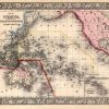 The Mitchell company was one of the first to try out the new technique of engraving on steel plates experimenting with steel almost 20 years before the rest of the publishing industry. He was printing with steel in the early 1830s; the general switch to steel was approximately 1850. During the early years of the company, Mitchell published mainly maps and travel guides. In 1860, Mitchell started producing “Mitchell’s New General Atlas”,and Mitchell Sr. retired and turned the business over to his son of the same name. The New General Atlas was published until 1893. Today Mitchell maps are sought after for their fine engraving, bright coloring, and attention to detail. They are some of the finest maps produced during this time period. This map produced in 1866, has Mitchell’s unique floral border, and beautiful hand coloring. This map details Oceanica exhibiting its various divisions and Island Groups with an inset map of the Sandwich Islands. Countries, cities, towns, lakes, rivers, mountains, and transportation routes are noted. Each map was printed on thick paper with vibrant hand color.