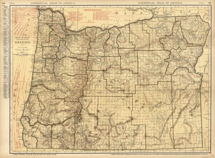 This map of Oregon was produced by Rand McNally and Co. as part of its Commercial Atlas of America. The detail shown on each map is exceptional because of the map size. These maps were intended to be used by business for shipping, etc. Roads, railroads, and rivers are clearly shown. There is more detail on these maps than any others during this time period.
