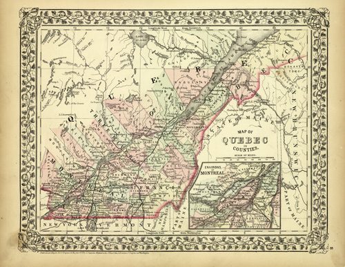 This map was made my S. Augustus Mitchell in 1872. The traditional ivy border, and hand coloring make this map beautiful. This map illustrates Quebec in counties distinguised by pastel coloring. An inset map of the environs of Montreal. Topographical features, cities, towns and transportation routes are dipicted in detail as well.