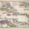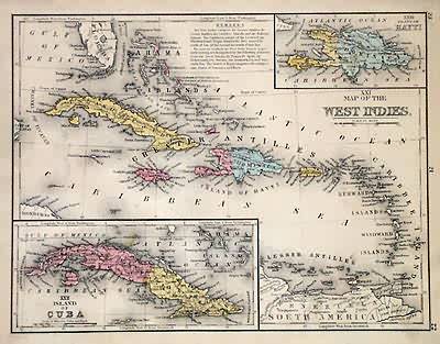 This original hand colored map came from Mitchell’s New School Atlas, published in 1873. This map details cities and towns, rivers, topography, and existing railroads at the time. Wagon trails and major routes of transport are also shown. On relevant maps native indian tribes are labeled. Insets of the islands of Hayti and Cuba are shown.