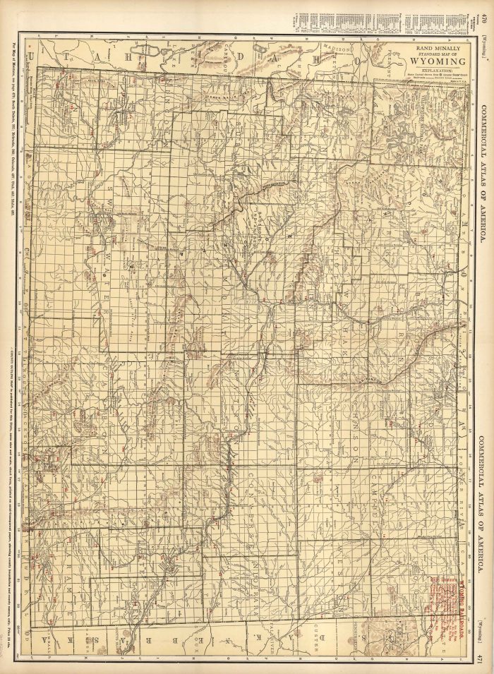 This map of the Wyoming was produced by Rand McNally and Co. as part of its Commercial Atlas of America. The detail shown on each map is exceptional because of the map size. These maps were intended to be used by business for shipping, etc. Roads, railroads, and rivers are clearly shown. There is more detail on these maps than any others during this time period.