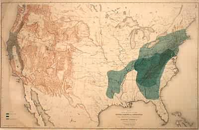 The Department of the Interior, Census Office made this “Report on Forest Trees of North America” based on information gathered in the tenth census, circa 1890. The distribution of Chestnut and Chinquapin trees in North America (except Mexico) are shown on this map. Regions are distinguished by bright colors. The names of states and important cities are printed lightly on the map.