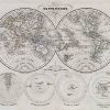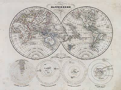 E. V. Monin made the “Atlas Universel de Geographie Ancienne & Moderne en 42 Cartes” circa 1832 in Paris. Bright colors highlight regions on these small, but detailed maps. This hand colored, French map illustrates the eastern and western hemispheres and the orbits of planets in the solar system. The names of regions, important cities, mountain ranges, lakes and rivers are identified. These old maps are in very good condition with unique outline coloring.