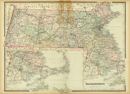 This beautiful, hand colored, steel plate engraved map of Massachusetts was made by William Bradley & Bros. in 1889. Pastel color distinguishes regions on this very detailed map from the hard to find map-maker. Counties, important cities, rivers, lakes, and mountain ranges are identified on the map. Barn stable, Duke, and Nantucket are shown at a greater scale in the inset.