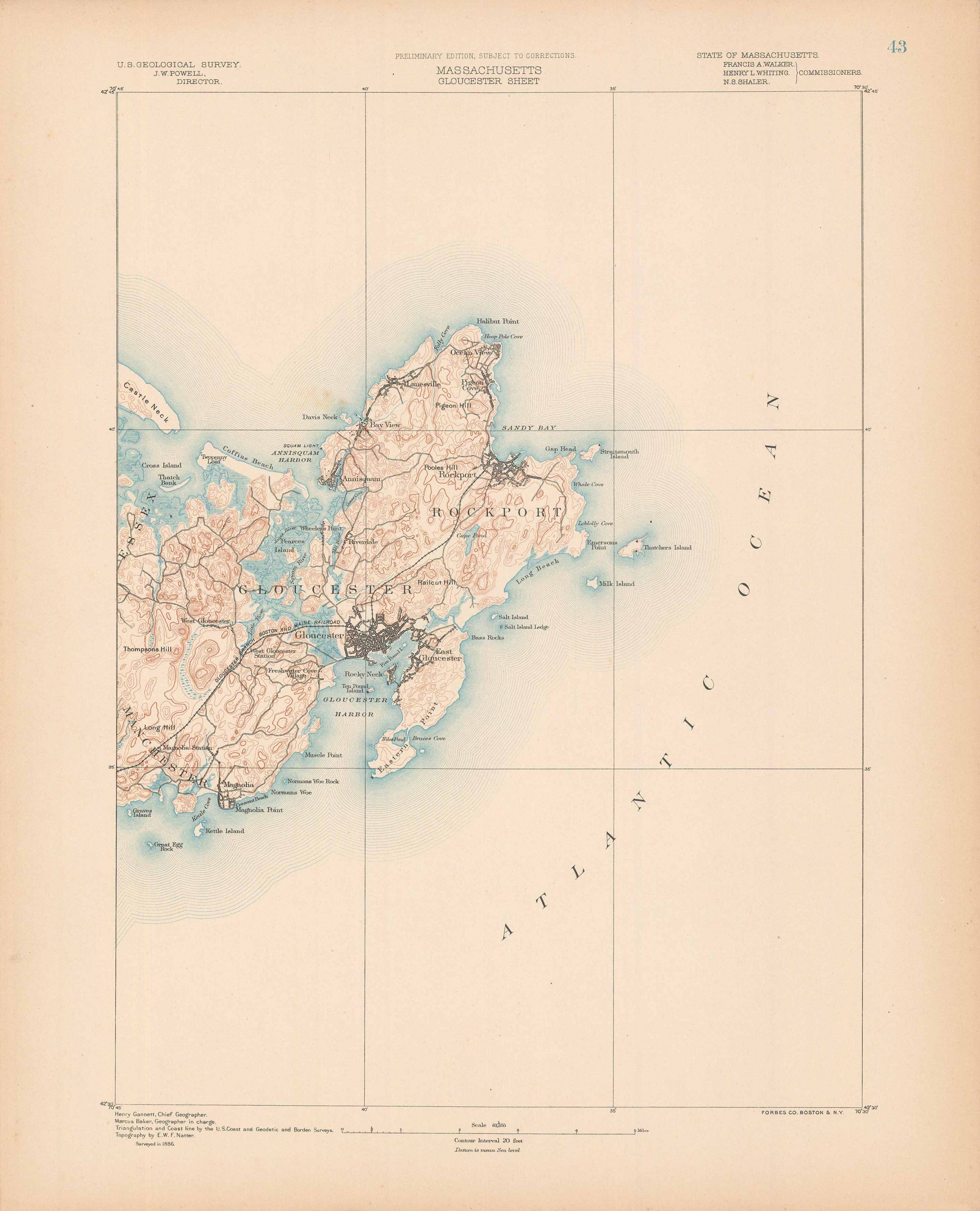 Art Source International is pleased to offer topographical surveys from the 1884-1888 Atlas of Massachusetts. This finely detailed collection was made by the United States Geological Survey and the Commissioners of the Commonwealth. These maps show the topography of Massachusetts counties and towns, including such features as railroads, buildings, wagon trails, rivers, lakes and ponds.