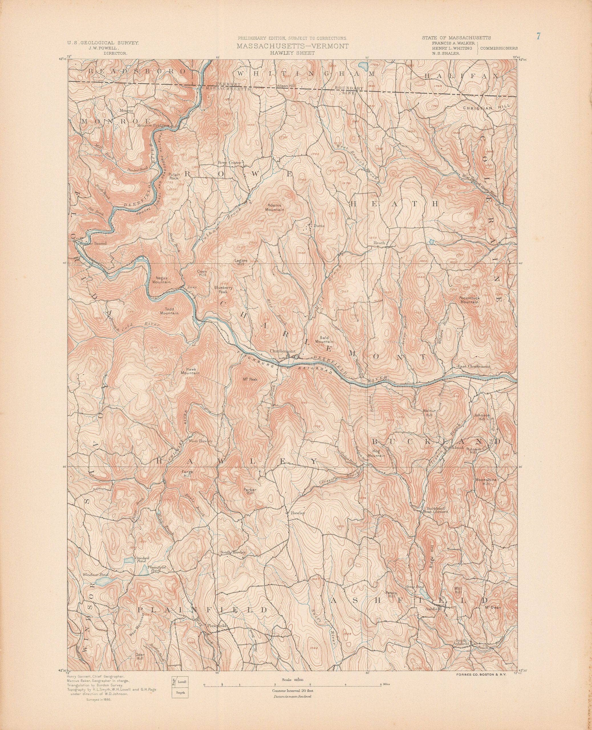Art Source International is pleased to offer topographical surveys from the 1884-1888 Atlas of Massachusetts. This finely detailed collection was made by the United States Geological Survey and the Commissioners of the Commonwealth. These maps show the topography of Massachusetts counties and towns, including such features as railroads, buildings, wagon trails, rivers, lakes and ponds.