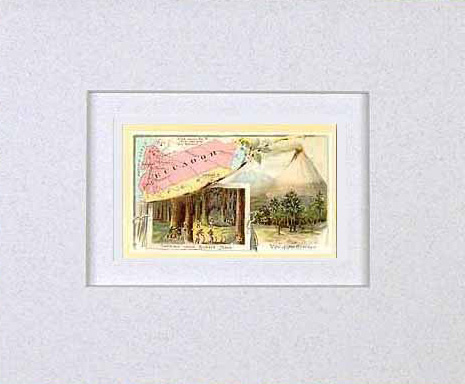 Founded in the 1860s, the Arbuckle Coffee Company grew and expanded with 19th century America. It was a staple the cowboys carried with them on the trail, and a commodity commonly found in American homes at the time. The Arbuckle Company made a unique advertising effort in the late 1880’s and began to enclose small decorative trade cards in their packages of coffee. The front of the card contained a colorful image of children, flowers, sports or even a map, while the back of the card had their advertising and some descriptive information. Later these trade cards became so collectible that the company focused on their success and issued them separately as premiums. These charming map cards illustrate beautifully the history and character the lands. Each map shows lakes and rivers, cities and towns, forts, the population, and area in square miles. Each card measures 3 1/4″ x 5 1/4″. The matted size is 8 x 10.