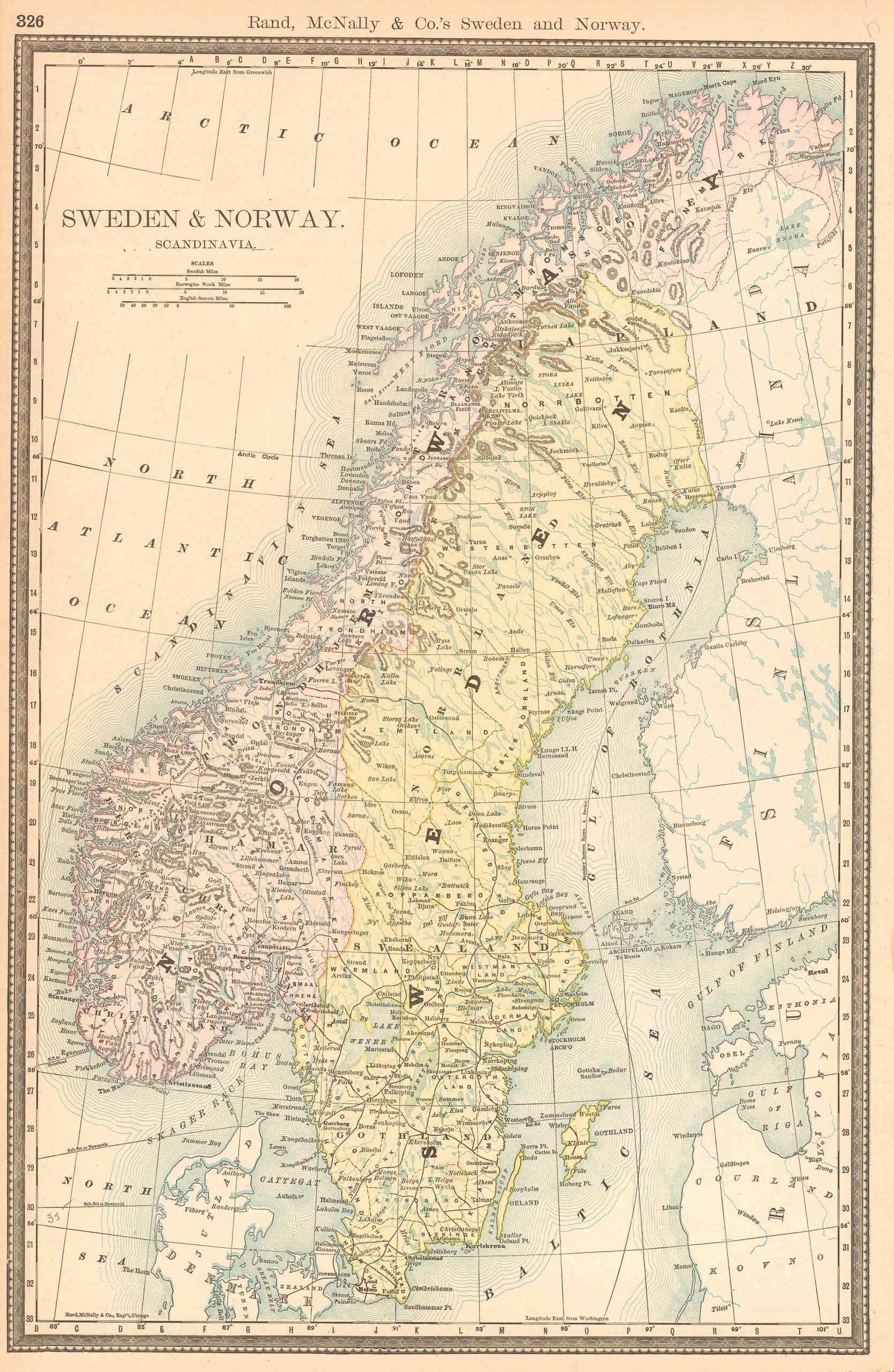 We are proud to offer this map of Sweden and Norway, originally produced as part of Rand McNally’s Enlarged Business Atlas dated 1891. Although the table of contents shows different editions starting in 1885, we believe this is the first edition of the Enlarged Atlas. Each of these maps accurately locates all cities, towns, post offices, railroad stations, villages, counties, parishes, islands, lakes, rivers, mountains and more. Until McNally’s enlarged Business Atlas, maps had never been produced that provided as much information as these do. Even today, we use these 130 year old maps to locate small towns, villages, and railroad routes that are no more.