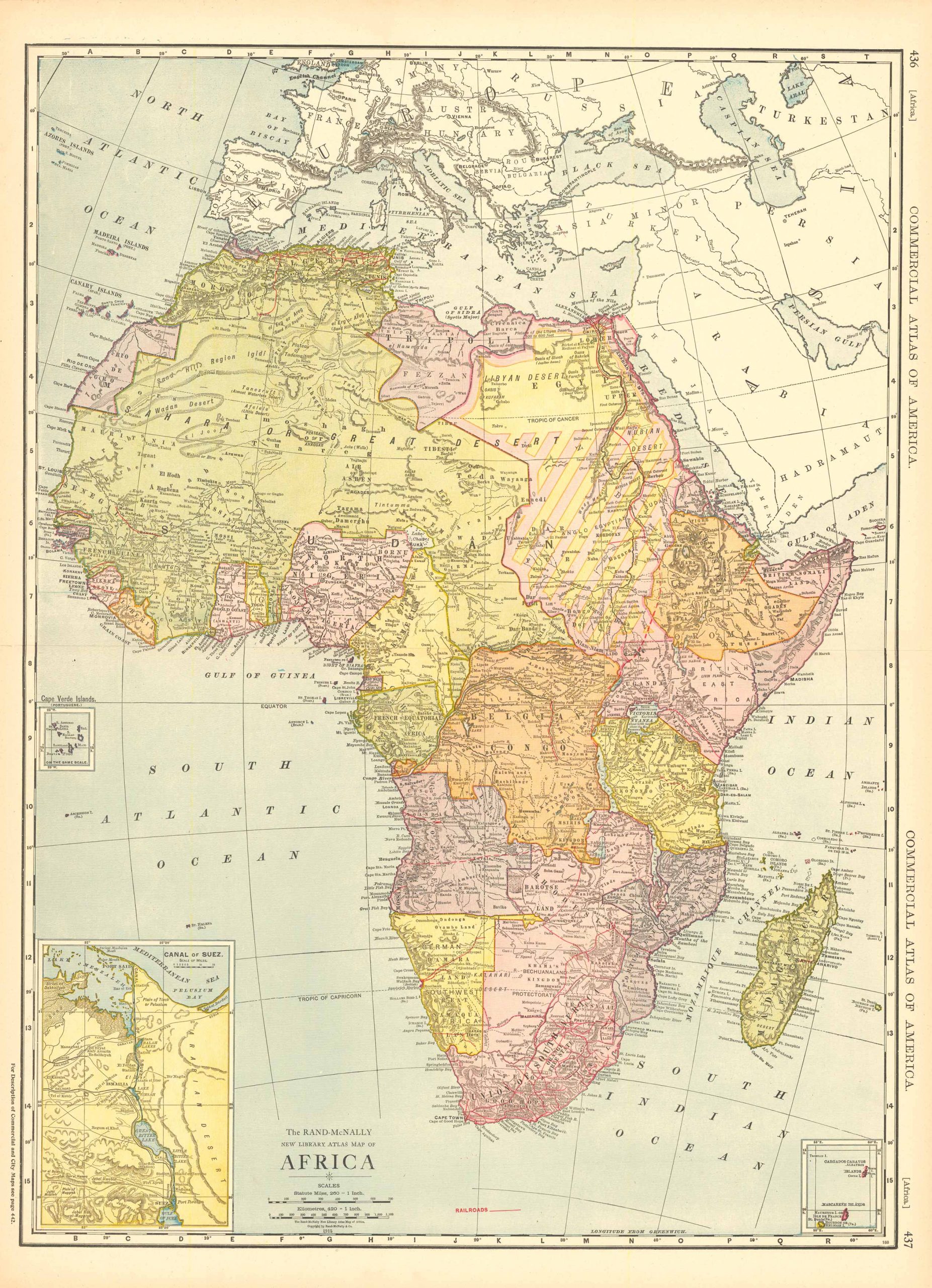 This map of Africa was produced by Rand McNally and Co. as part of its Commercial Atlas of America. These maps are some of our favorite maps because of the large size of each map sheet (25.5”x20.5”). The detail shown on each map is exceptional because of the map size. These maps were intended to be used by business for shipping and other uses. Roads, railroads, rivers, and buildings are clearly shown. There is more detail on these maps than any others during this time period.