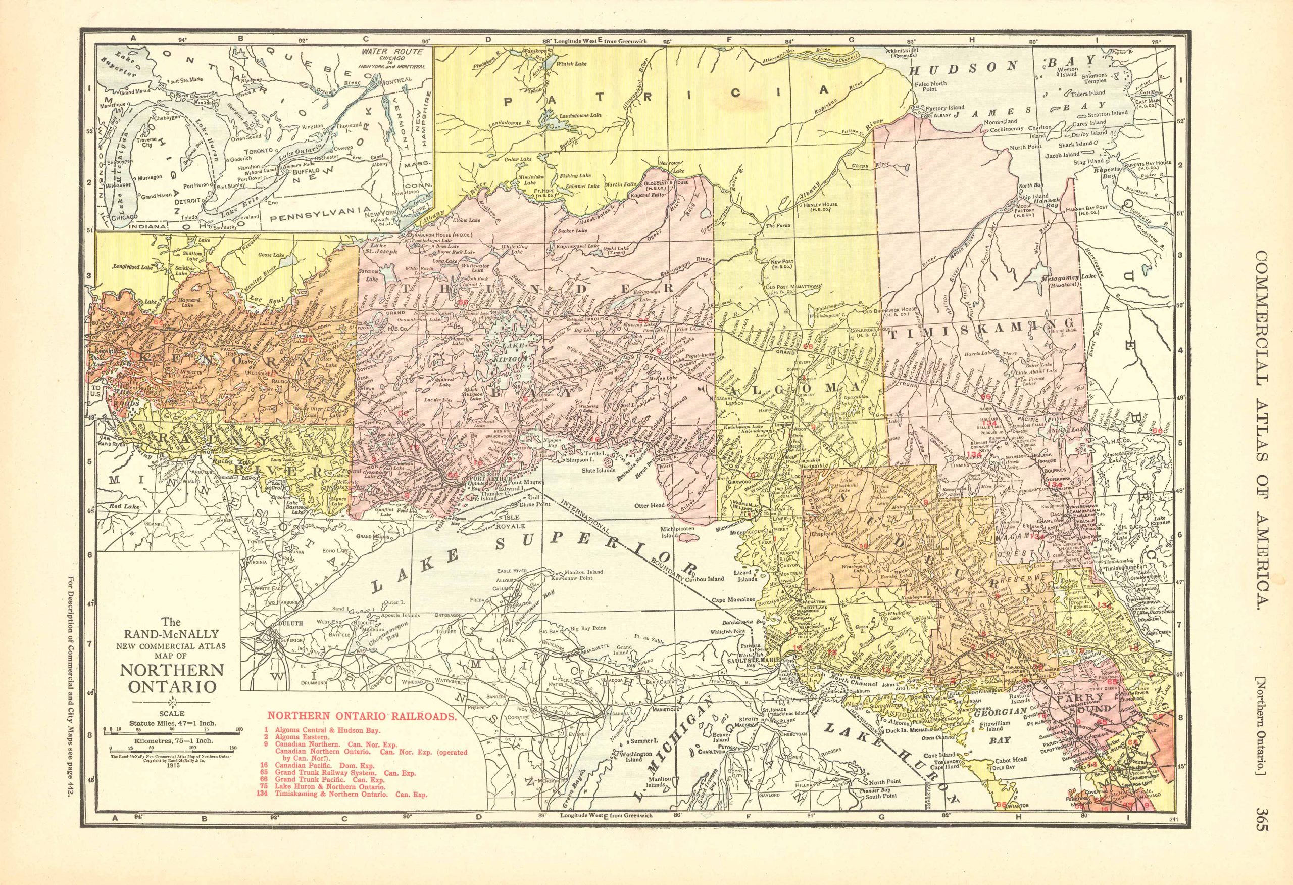 This map of Northern Ontario was produced by Rand McNally and Co. as part of its Commercial Atlas of America. These maps are some of our favorite maps because of the large size of each map (25.5 x 20.5). The detail shown on each map is exceptional because of the map size. These maps were intended to be used by business for shipping and other uses. Roads, railroads, rivers, and buildings are clearly shown. There is more detail on these maps than any others during this time period.