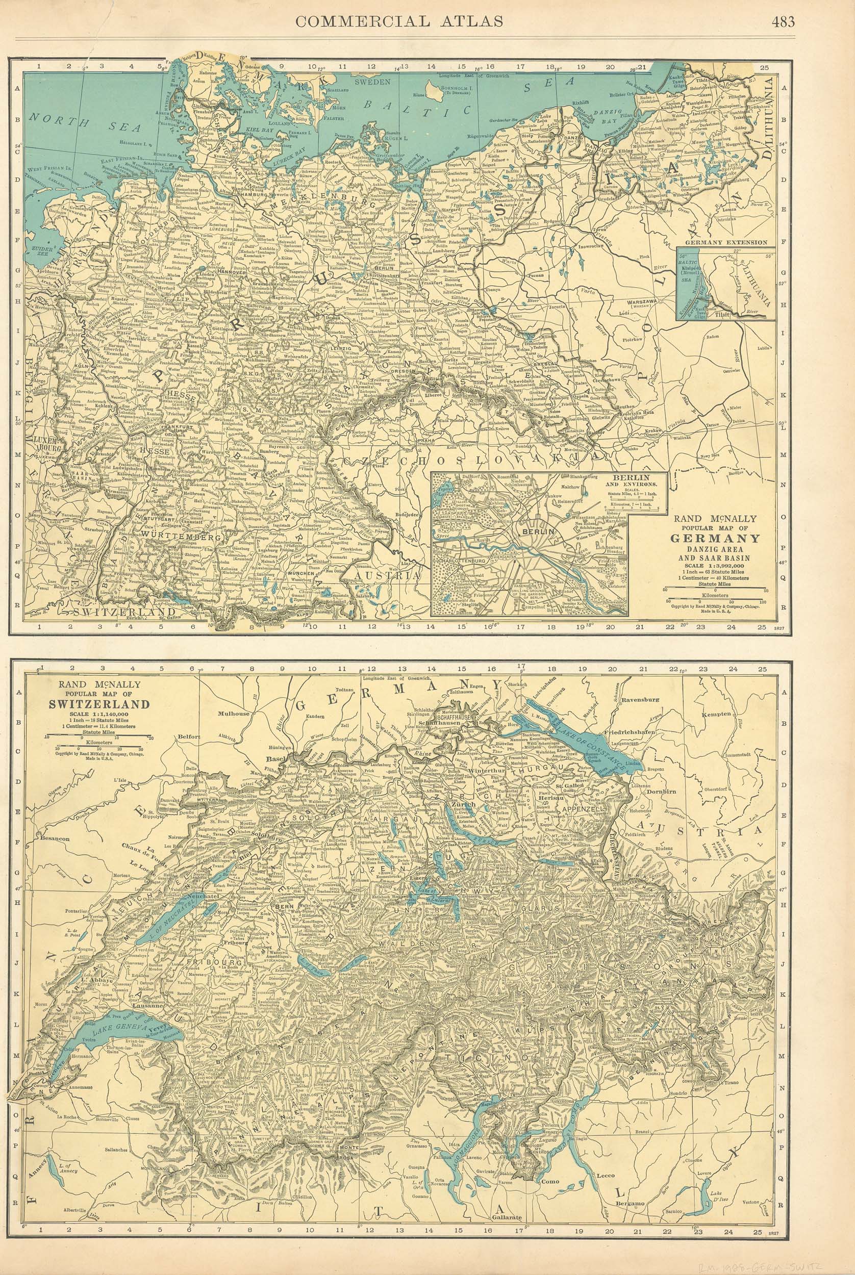 McNally’s 1928 Map of Germany (Danzig Area & Saar Basin) & Switzerland