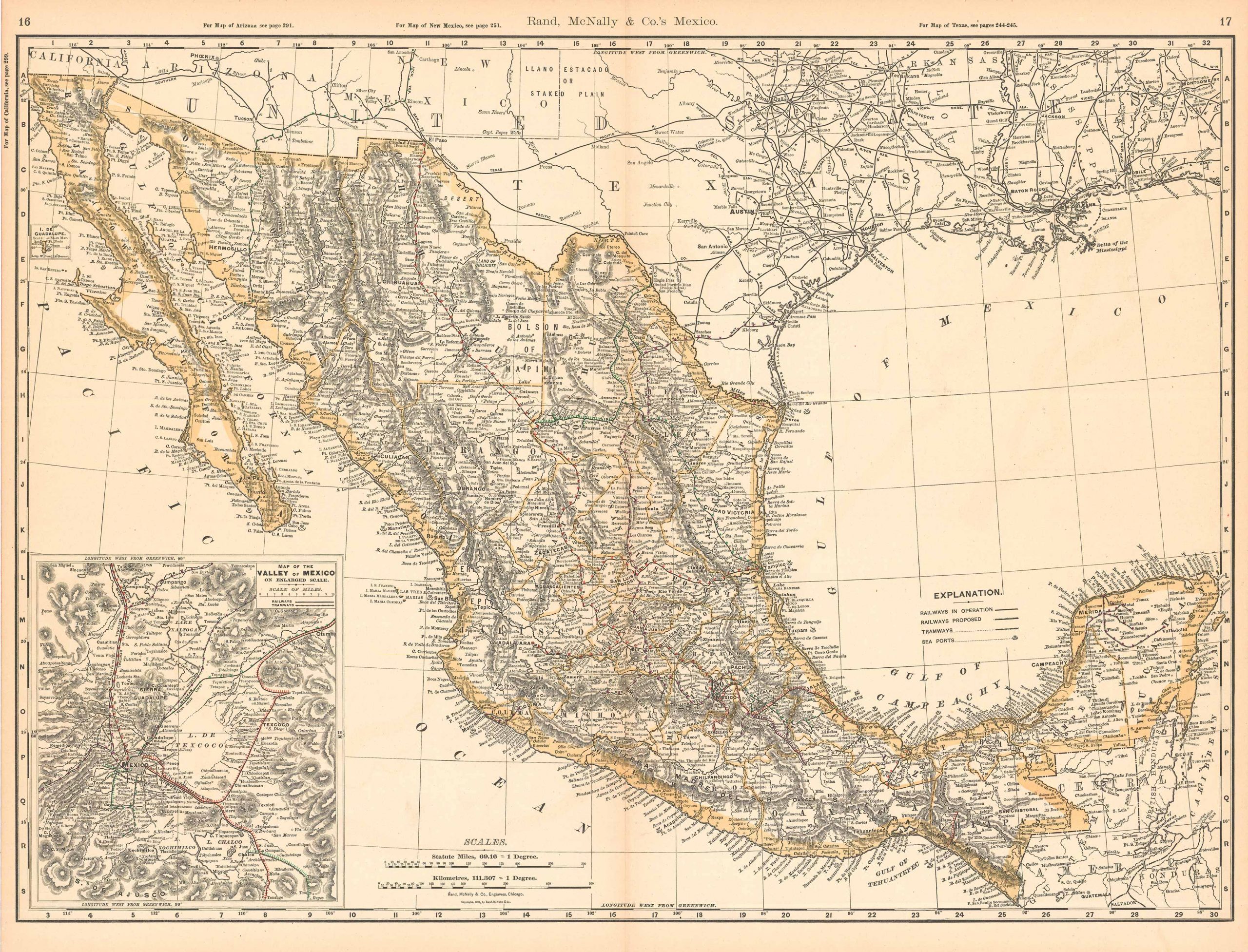 We are proud to offer this map of Mexico, originally produced as part of Rand McNally’s Enlarged Business Atlas, dated 1891. Although the table of contents shows different editions starting in 1885, we believe this is the first edition of the Enlarged Atlas. Each of these maps accurately locates all cities, towns, post offices, railroad stations, villages, counties, parishes, islands, lakes, rivers, mountains and more. Until McNally’s enlarged Business Atlas, maps had never been produced that provided as much information as these do. Even today, we use these 130 year old maps to locate small towns, villages, and railroad routes that are no more.