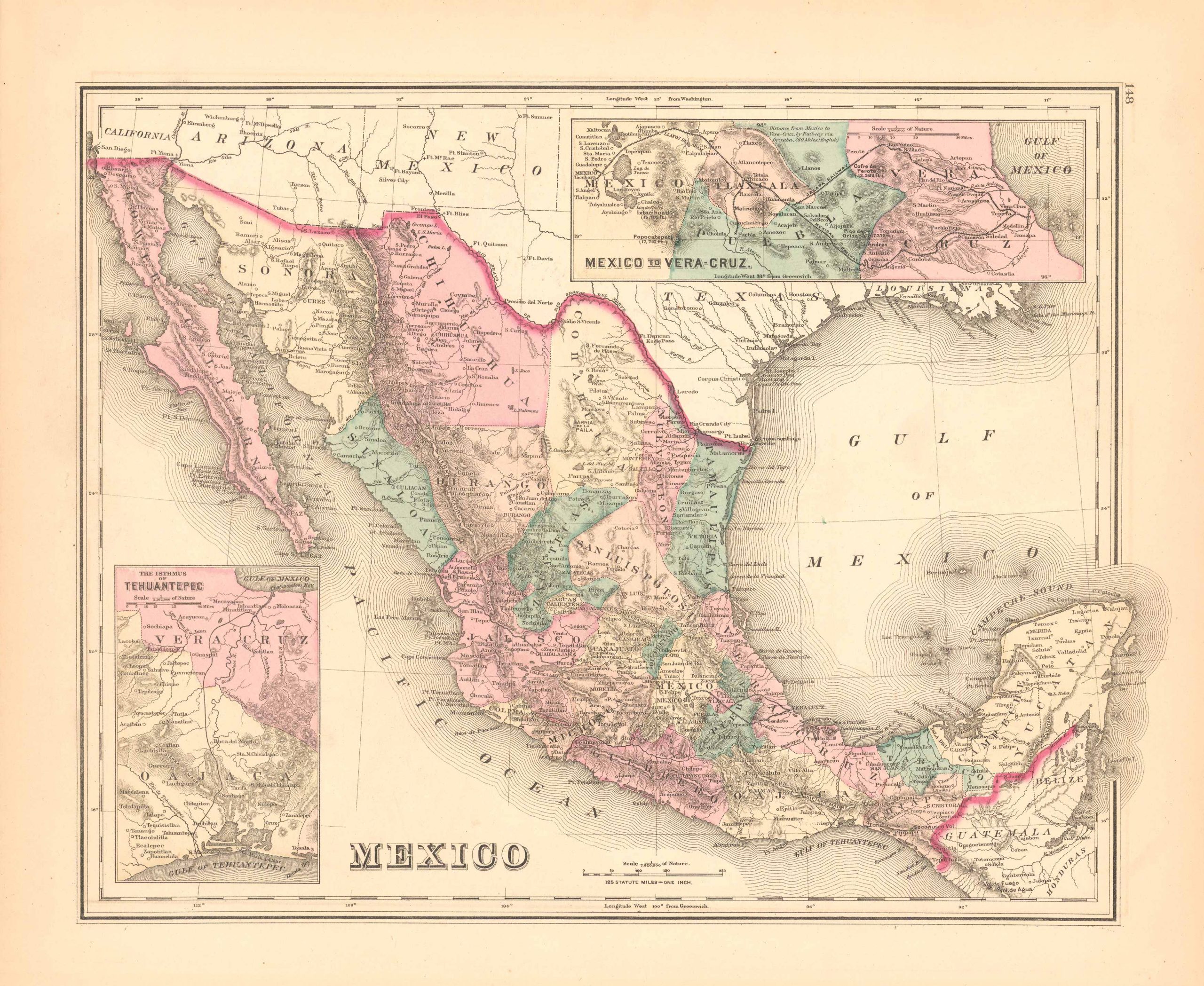 This hand colored map was published by O.W. Gray in 1879. Mexico, Vera Cruz and the Isthmus of Tehuantepec are illustrated on this map. Details include counties distinguished by vibrant pastel color, waterways, railroads, and the names of important cities. This map is remarkably well preserved with exceptionally bright hand-coloring.
