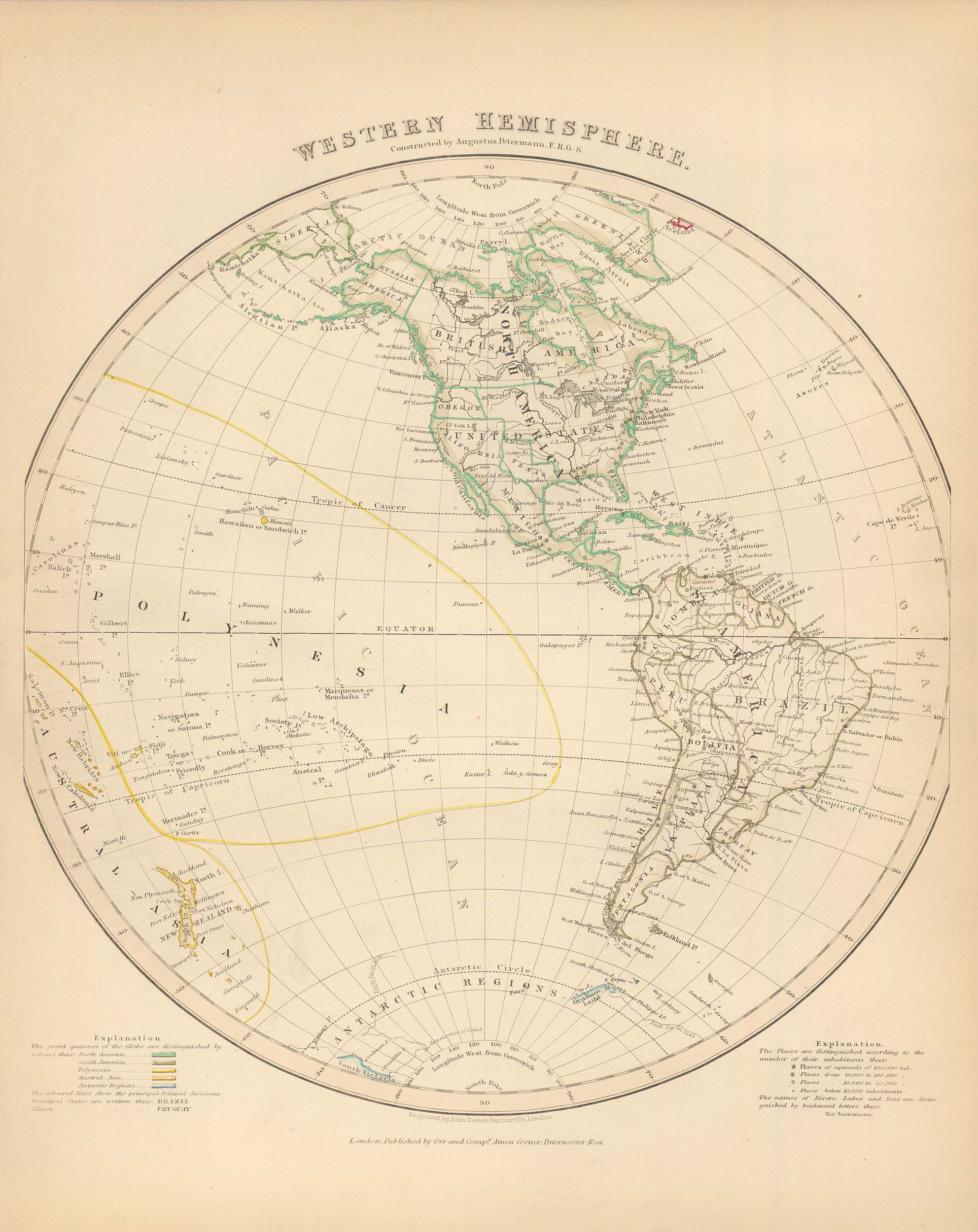 This wonderful map is the work of Reverend Thomas Milner. The map is derived from the work of Augustus Peterman. 1850 was the first edition of his atlas, “A Descriptive Atlas of Astronomy and of Physical and Political Geography”. This atlas has not only political maps of the world but also Thematic maps showing the meteorology, hydrography, zoology, botany, ethnography, and other aspects of the physical world. In over 20 years there have only been two examples of Millner-Petermann atlas sold. These maps are hand colored in outline and were printed in London.