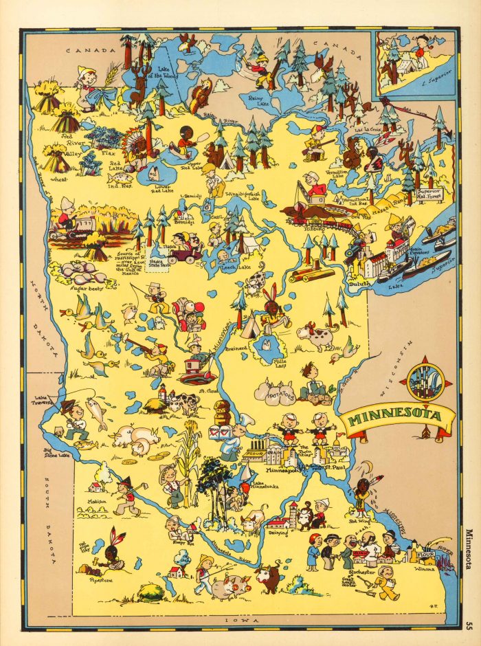 This charming antique pictorial map was published in 1935 by the famous mapmaker & illustrator, Ruth Taylor (White). These illustrated maps came from the atlas, “Our U.S.A – A Gay Geography,” with text by Frank Taylor & the maps done by Ruth Taylor. Ruth Taylors maps have become increasingly rare. Her whimsical maps are bold, colorful, and full of life; showing the local feel, cultural stereotypes, industries and activities of the area. These maps have become very difficult to find and would be a great addition to any map collection.