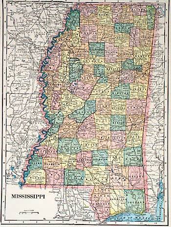 This map was produced for the “Monarch Standard Atlas” , by J.Martin Miller in 1905. Mississippi illustrated on this map, with a list of counties and chief cities to the left of the map. Counties are distinguished by color. Other details include illustrations of lakes, rivers,and mountains. The atlas proclaimes that it offers “complete, original and authentic maps of the present developement of all the countries, empires and states of the world comprising a graphic description of the people: their civilization, their religion, their government, their cities, their important exports, their wealth, their railways, their canals, their cables, their telegraphs, ect., including a description of their climate, the productions, the rivers, the valleys, the lakes, the mountains, the minerals, the glaciers, and every other subject of interest to the american people.”