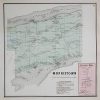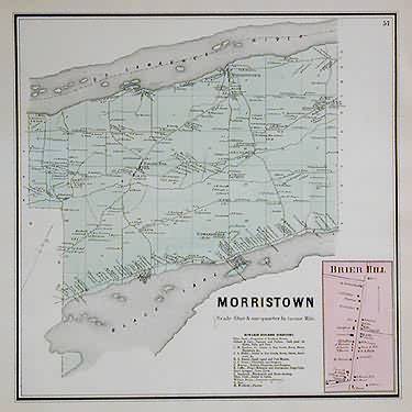 The “New Topographical Atlas of St. Lawrence County, New York” was made from the surveys of D. G. Beers, and published by Stone & Stewart in 1865. Each hand colored map illustrating a town in St. Lawrence includes abundant, historically significant details. The name of the town, streets, railroad lines, important buildings, the locations of property and the names of landowners, parks, rivers, and more relevant features are identified. This map shows Morristown and the surrounding area with an inset of Brier Hill and a list of local businesses.
