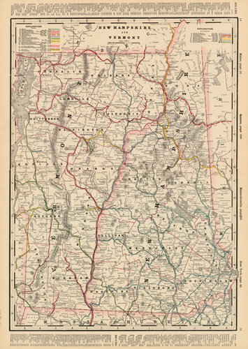 Art Source International is proud to offer this hard to find map from George F. Crams 1897 Standard American Railway System Atlas. This map of New Hampshire and Vermont has exceptionally bright colors, crisp bright paper, and precisely depict the railroad routes in great detail. Every railroad line is named, numbered, and color-coded by a legend on the map; giving a detailed glimpse into the prolific rail system of turn of the century America. In addition, cities, towns, lakes, rivers, creeks and mountain ranges are shown. The maps in this collection are a rare find and are some of the finest that Cram has produced.