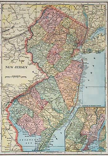 This map was produced for the “Monarch Standard Atlas” , by J. Martin Miller in 1905. New Jersey is illustrated on this map with a list of counties and chief cities to the right of the page. An inset shows the environs of Hudson County at a greater scale than the main map. Counties are distinguished by color. Other details include major roads,illustrations of lakes, rivers,national parks, and mountains. The atlas proclaimes that it offers “complete, original and authentic maps of the present developement of all the countries, empires and states of the world comprising a graphic description of the people: their civilization, their religion, their government, their cities, their important exports, their wealth, their railways, their canals, their cables, their telegraphs, ect., including a description of their climate, the productions, the rivers, the valleys, the lakes, the mountains, the minerals, the glaciers, and every other subject of interest to the american people.”