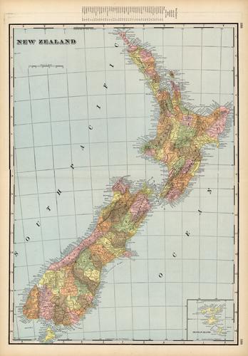 We at Art Source International are excited to offer this rare map of New Zealand from George F. Crams 1898 “Standard American Railway System Atlas”. This map is unique in that it is more detailed and larger than his standard mapping style.