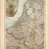 Adolf Stieler produced this exceptional map in 1905 for his “Hand-Atlas”. Maps produced by Stieler are known for their exceptional lithography and details include the names of regions and many cities, rivers, lakes, mountains, canals, railroads and other travel routes. Inset maps show Brussels and Amsterdam.
