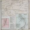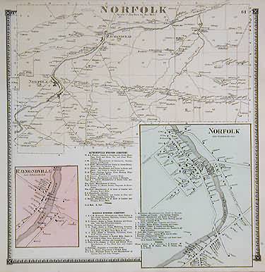 The “New Topographical Atlas of St. Lawrence County, New York” was made from the surveys of D. G. Beers, and published by Stone & Stewart in 1865. Each hand colored map illustrating a town in St. Lawrence includes abundant, historically significant details. The name of the town, streets, railroad lines, important buildings, the locations of property and the names of landowners, parks, rivers, and more relevant features are identified. This map shows Norfolk and its surrounding area with insets of the main section of Norfolk and of Raymondville, as well as lists of local businesses.