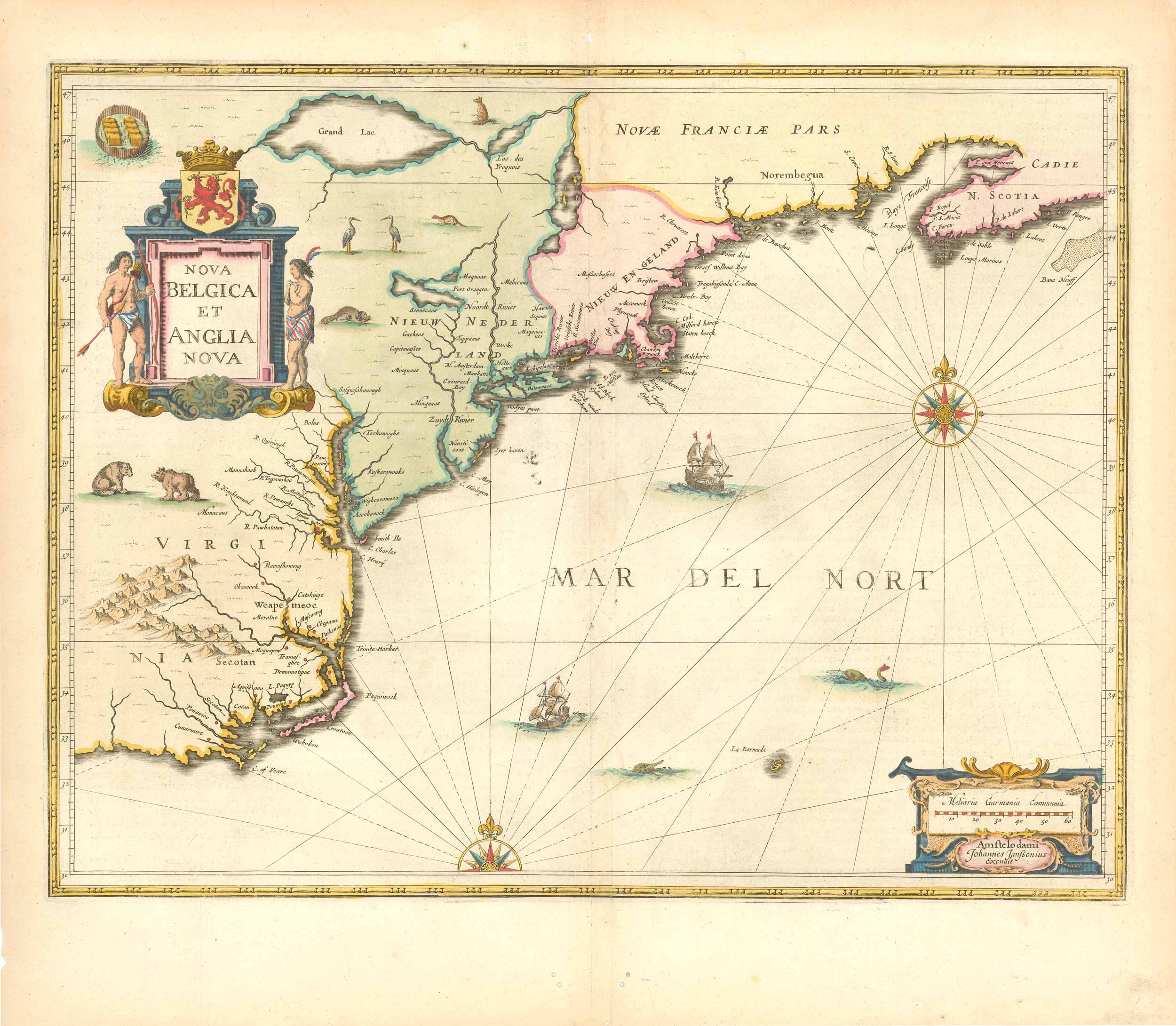 Building upon earlier works, Jansson’s map incorporates advancements from Johannes de Laet’s 1630 map and Hessel Gerritsz’s cartography, providing a more accurate depiction of coastal features such as the Hudson River (Noorde Rivier), Delaware River (Zuydt Rivier), and the depiction of New Amsterdam (modern-day New York City). While coastal areas are rendered with improved precision, the interior regions still reflect speculative geography, including the depiction of large, mythical inland lakes, a common feature in maps of that era.