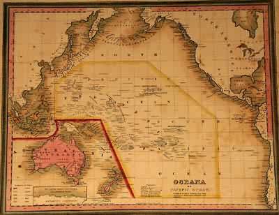 Art Source International is proud to present maps from Henry Schenk Tanners “New Universal Atlas”, a volume of work which in 1828 was hailed as a great advancement in the art and science of map-making. Tanner gained notoriety for this work and the one he published before it, his “New American Atlas.” Both were widely considered to be important contributions to early American cartography. This remarkable and rare map of “Oceana or The Pacific Ocean” was created for the 1836 edition of the “New Universal Atlas.” The unique look is framed by a sage and pink border that complements the original hand coloring in the image of the map. A small inset at the bottom of the map shows Wilkes” Discoveries (of Antarctica) on a reduced scale. The territorial waters of Australia and Polynesia are divided by bright bands of color. The many islands are listed at one of the greatest degrees of accuracy for maps produced at this time. This map is a true american rarity!!!’