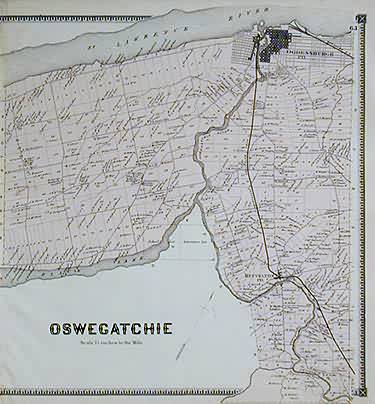 The “New Topographical Atlas of St. Lawrence County, New York” was made from the surveys of D. G. Beers, and published by Stone & Stewart in 1865. Each hand colored map illustrating a town in St. Lawrence includes abundant, historically significant details. The name of the town, streets, railroad lines, important buildings, the locations of property and the names of landowners, parks, rivers, and more relevant features are identified. This map shows Oswegatchie and its surrounding area.