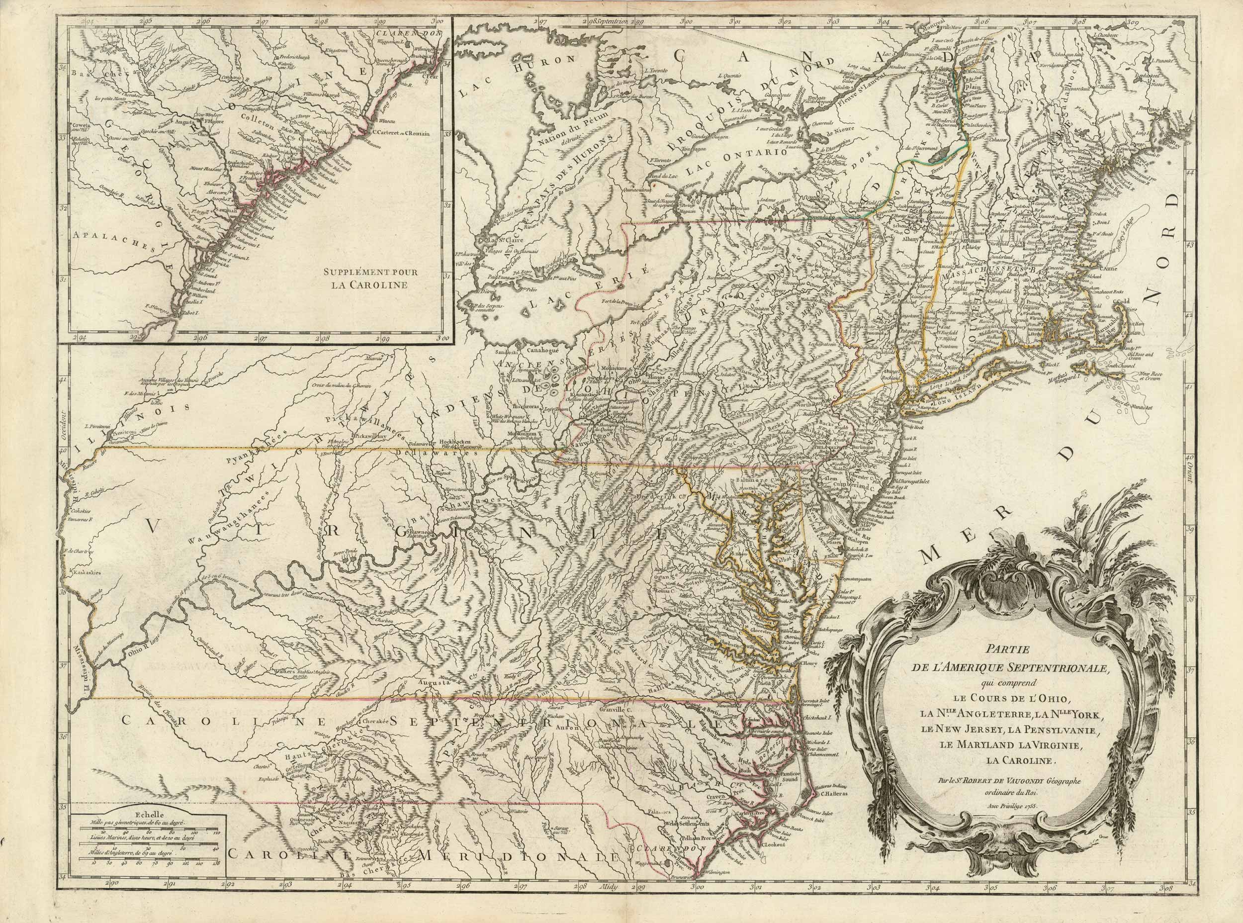 The map titled “Partie de l’Amérique septentrionale, qui comprend le cours de l’Ohio, la Nlle. Angleterre, la Nlle York, le New Jersey, la Pensylvanie, le Maryland, la Virginie, la Caroline”, was created by Gilles Robert de Vaugondy, one of the foremost French cartographers of the 18th century. Published around 1755, it offers a detailed French perspective on the eastern regions of North America, with a particular focus on the British colonies and the Ohio River Valley—an area of significant geopolitical interest at the time. This map captures the rising tensions between France and Britain over territorial claims in the Ohio Valley, a key flashpoint that contributed to the outbreak of the French and Indian War (1754–1763), the North American theater of the larger Seven Years’ War. It depicts the British colonies of New England, New York, New Jersey, Pennsylvania, Maryland, Virginia, and the Carolinas, and features rivers, forts, Indigenous lands, and patterns of European settlement. Vaugondy relied on a mix of French military reports, earlier maps, and Indigenous sources to compile the map, making it both a tool for navigation and a visual assertion of French territorial ambitions. An inset provides additional detail on the Carolinas, and the map stands out for its thorough representation of Native American tribes. Today, it remains an important historical document from a time of intense colonial rivalry in North America.