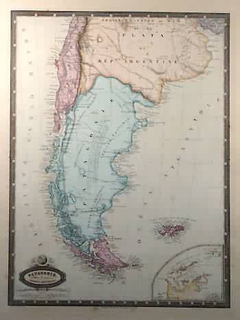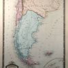 M. F. A. Garnier made the “Atlas de Geographie” in 1862. The maps in this atlas would frame nicely due to their extraordinarily beautiful hand coloring and title plates and their large margins. Patagonia is illustrated on this map with pastel pink, yellow, blue, purple and green coloring used to distinguish regions. An inset shows the South Shetland Islands at the same scale as the main map. The names of regions, possessions, important cities, island chains, mountains, rivers and lakes are identified in French.