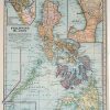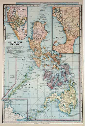 This map was produced for the “Monarch Standard Atlas” , by J. Martin Miller in 1905. The Philippine Islands are illustrated on this map. Two insets show the vicinity of Manila at a greater scale than the main map.Important cities, major railroads, and roads are shown. The atlas states that it offers “complete, original and authentic maps of the present developement of all the countries, empires and states of the world comprising a graphic description of the people: their civilization, their religion, their government, their cities, their important exports, their wealth, their railways, their canals, their cables, their telegraphs, ect., including a description of their climate, the productions, the rivers, the valleys, the lakes, the mountains, the minerals, the glaciers, and every other subject of interest to the american people.”