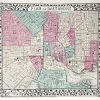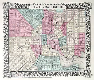 This hand colored map was made for “Mitchells New General Atlas” published in 1877 by S. Augustus Mitchell. Baltimore is illustrated on this map. Sections of the city are highlighted by color. Other details include the names of streets and important monuments, railroads, and rivers.