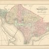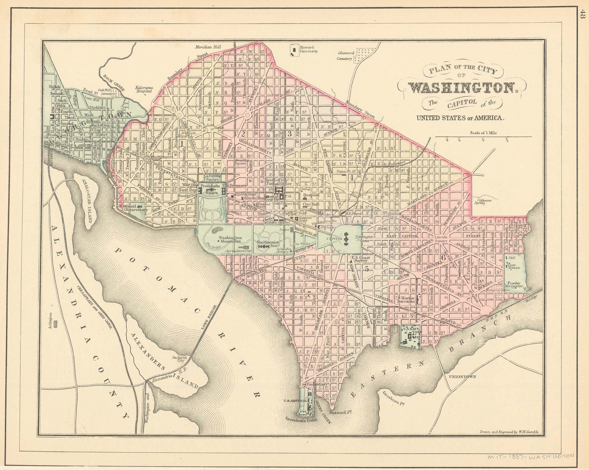 This map was made by S. Augustus Mitchell for “Mitchell’s New General Atlas” published in 1887. The well maintained maps in this atlas feature Mitchell’s characteristic pastel coloring and abundant details of geographical features. The plan of Washington D. C. is illustrated on this map. Details include the names of streets, important buildings, rivers, lakes, and railroads. Sections of the city are distinguished by color. These 1887 maps offer a fascinating perspective of areas that have since undergone significant growth and change, in addition to their value as great examples of Mitchell’s work. This map has water stains in the margin that do not affect the map.