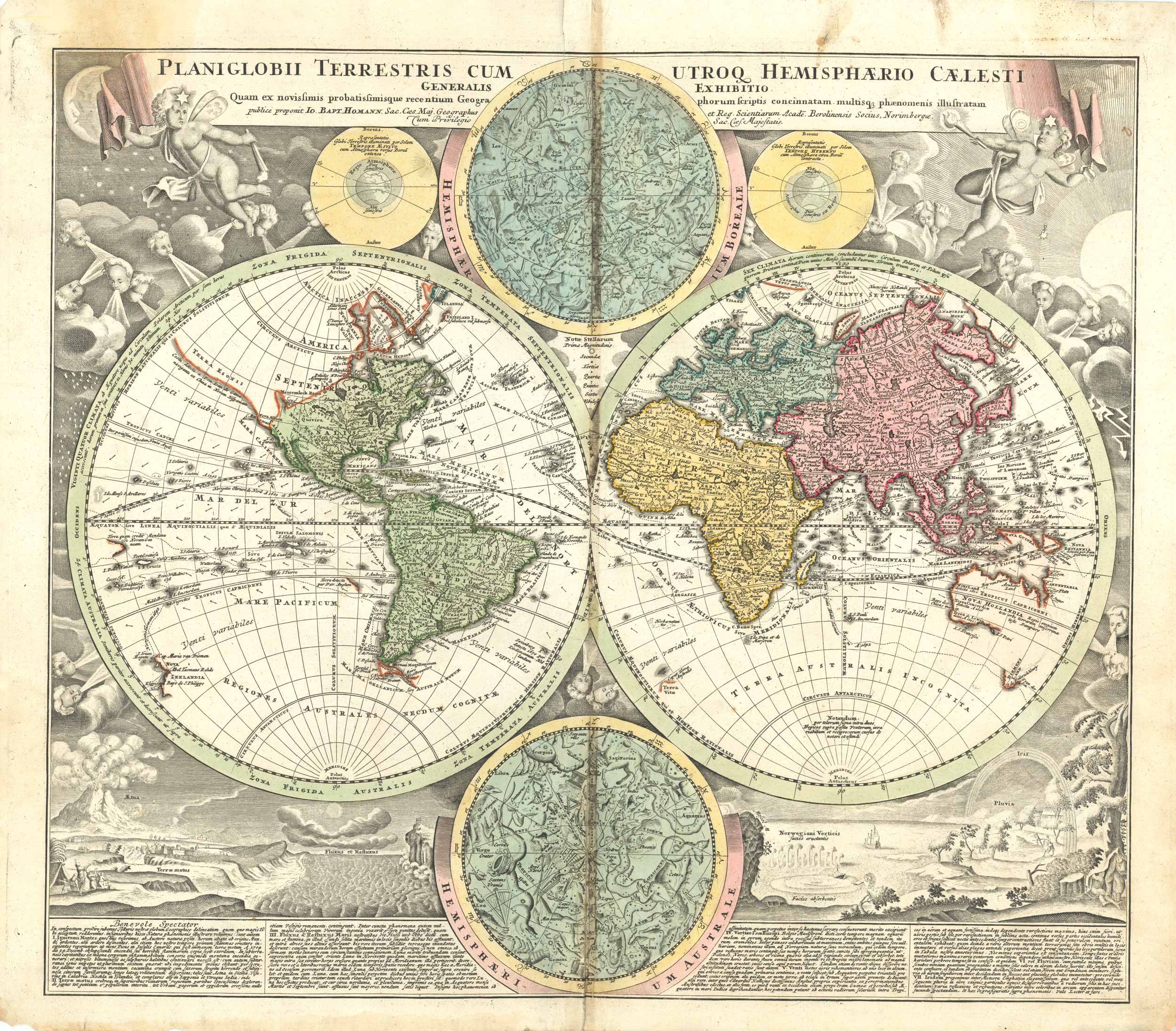 This richly decorated map features a double-hemisphere projection of the Earth accompanied by two celestial hemispheres. It is a fusion of geography, astronomy, and baroque artistry, designed not only to inform but to awe and inspire. Johann Baptist Homann’s “Planiglobii Terrestris cum Utriusque Hemisphærio Cælesti” map was highly popular in the early 18th century and, due to its success, it underwent multiple versions and reissues — both during his lifetime and under the imprint of his successors, Homann Heirs (Homann Erben).