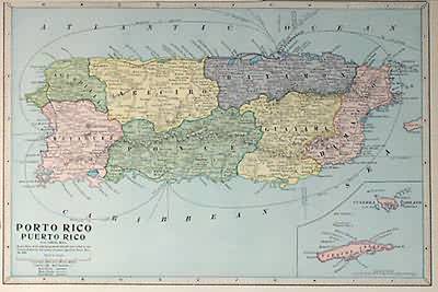 This map was produced for the “Monarch Standard Atlas” , by J. Martin Miller in 1905. Puerto Rico is illustrated on this map. An inset is included of Culebra and Vieques Islands at the same scale as the main map. Main sea routes are identified. Other details include the names of important cities, mountains, lakes, rivers and railroads. The atlas states that it offers “complete, original and authentic maps of the present developement of all the countries, empires and states of the world comprising a graphic description of the people: their civilization, their religion, their government, their cities, their important exports, their wealth, their railways, their canals, their cables, their telegraphs, ect., including a description of their climate, the productions, the rivers, the valleys, the lakes, the mountains, the minerals, the glaciers, and every other subject of interest to the american people.”