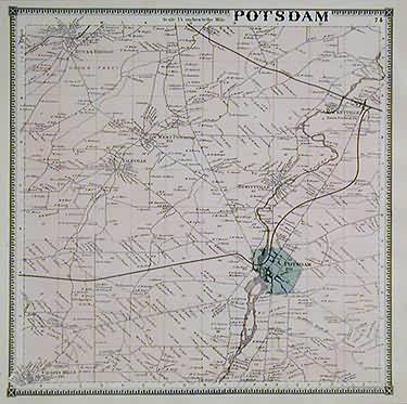 The “New Topographical Atlas of St. Lawrence County, New York” was made from the surveys of D. G. Beers, and published by Stone & Stewart in 1865. Each hand colored map illustrating a town in St. Lawrence includes abundant, historically significant details. The name of the town, streets, railroad lines, important buildings, the locations of property and the names of landowners, parks, rivers, and more relevant features are identified. This map shows Potsdam and the surrounding area.