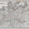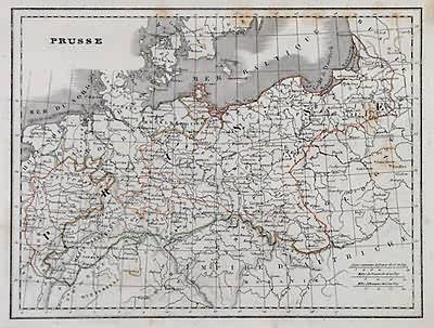 E. V. Monin made the “Atlas Universel de Geographie Ancienne & Moderne en 42 Cartes” circa 1822 in Paris. Bright colors highlight regions on these small, but detailed maps. This hand colored, French map illustrates Prussia. The names of regions, important cities, mountain ranges, lakes and rivers are identified. These old maps are in very good condition with unique outline coloring.