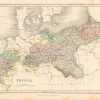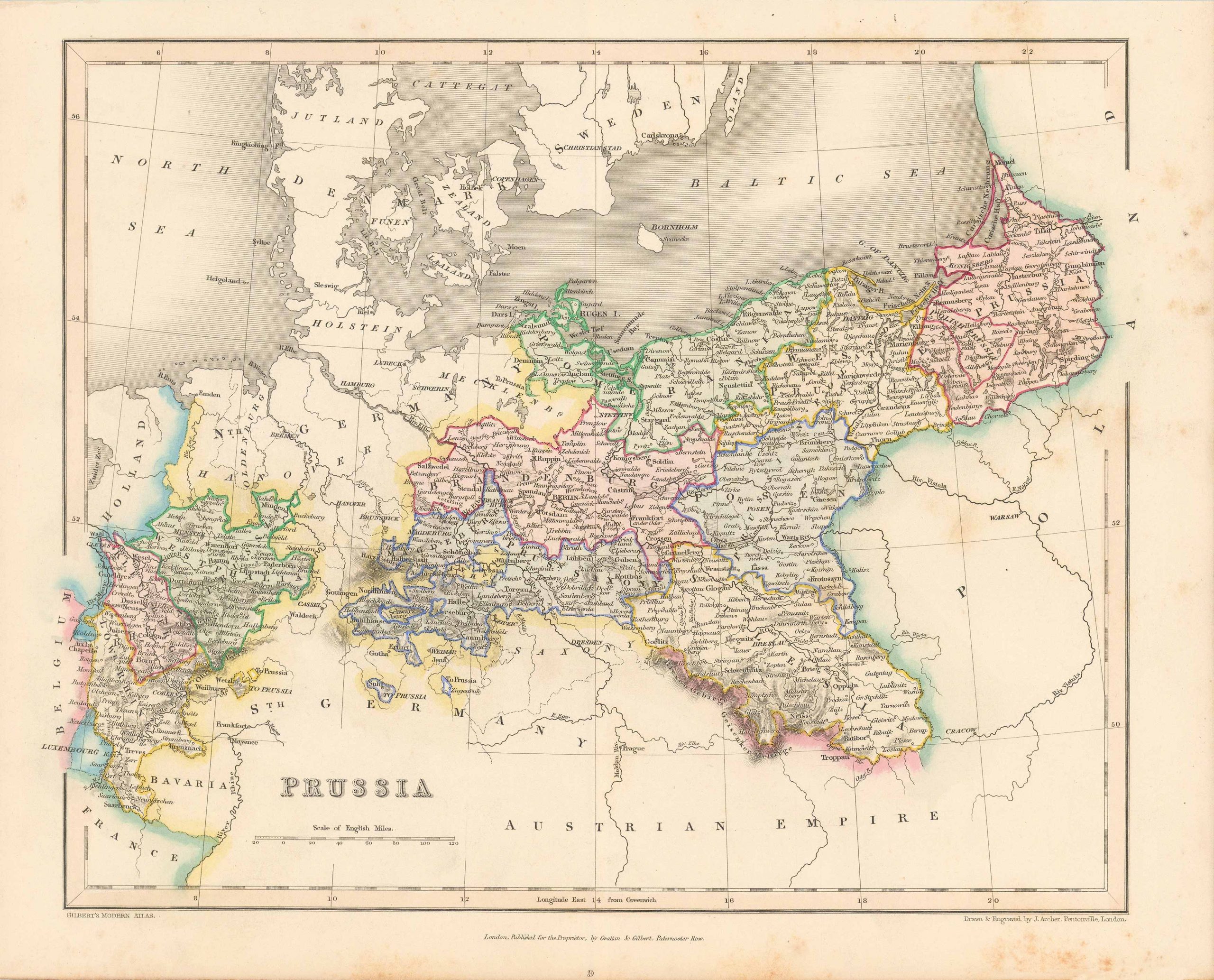 We are proud to offer this very rare map of Prussia by James Gilbert. This map was issued in 1840 as part of Gilbert’s Modern Atlas of the Earth. In our over 40 years in the antique map business, it is difficult to remember any finer maps than these. The coloring is exquisite, the engraving is exceptional, and the paper quality is extraordinary.
