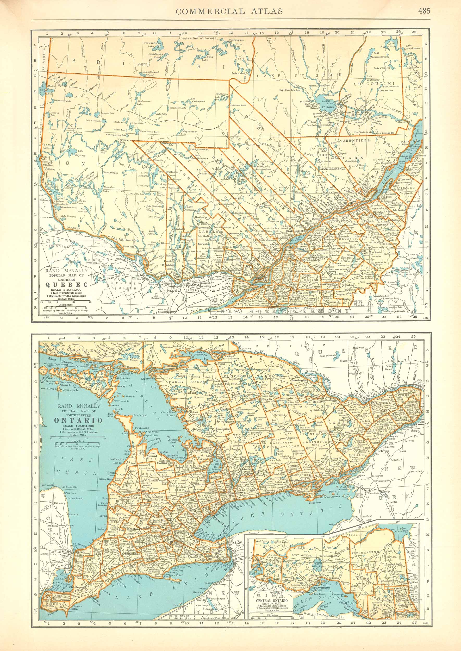 Rand McNally & Company, still a major name in map publishing to this day, began as a small print shop opened in Chicago in 1856 by William H. Rand. The shop originally printed guidebooks and directories. In 1858, Rand hired Andrew McNally who was later to become a partner. Within the next few years, the shop got into the railroad business by starting to print railway tickets and schedules, a key step in the development of the company. The ticket printing led to the publishing of railway guides, and by 1872 Rand McNally and Company had the capacity to publish maps. This map of Quebec and Ontario came from Rand McNally’s Commercial Atlas. A highly successful run of atlases that lasted over a decade. These maps were primarily used by business, because of their accurate listing of railroads in operation as well as tables of statistical information.