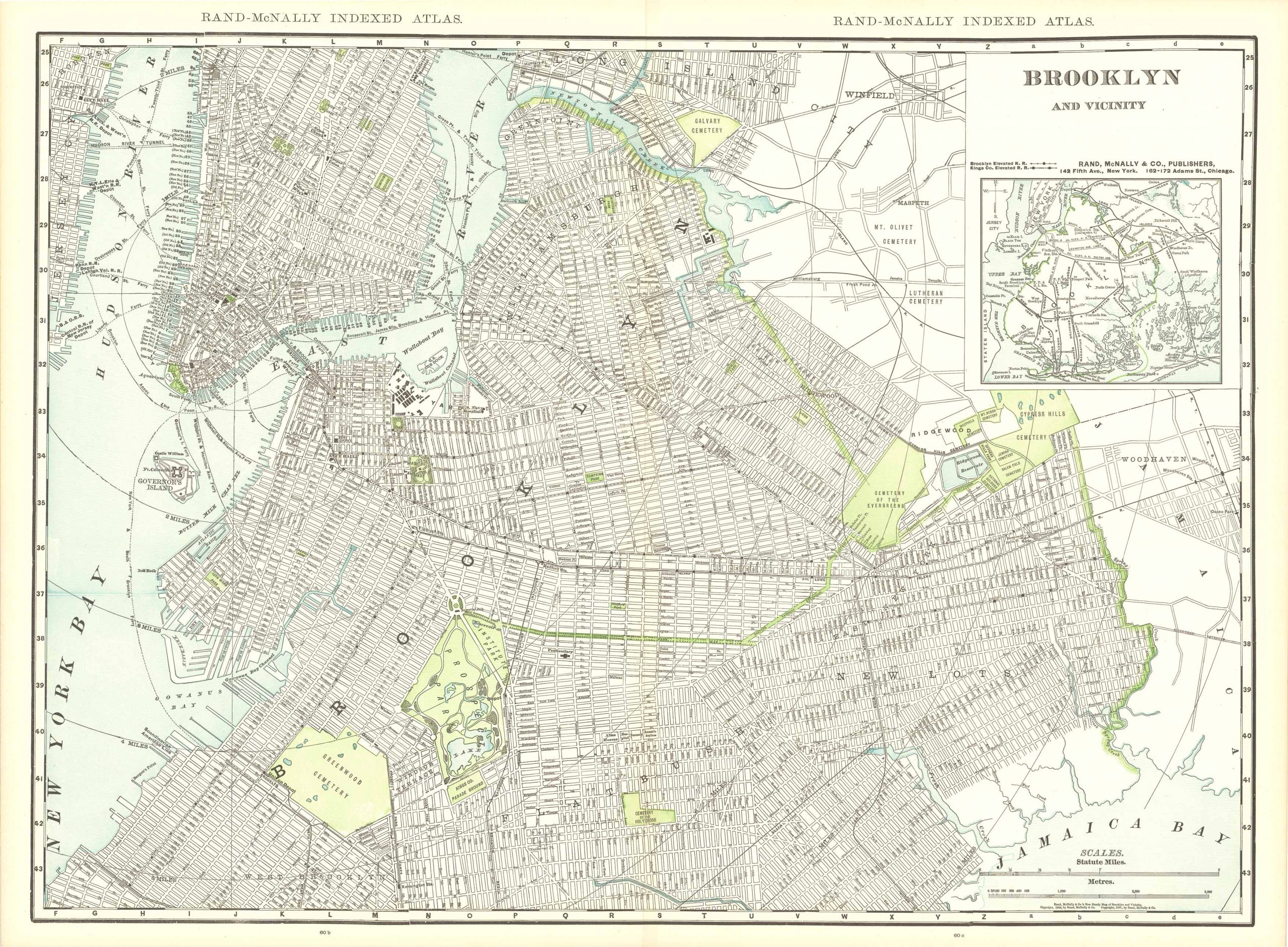 We are proud to offer this wonderful large scale map of Brooklyn and Vicinity originally issued as part of Rand McNally’s Enlarged Business Atlas and Shippers Guide in 1907.  The maps from this atlas were larger than most atlas’ published at the time and show many more cities and towns.  All railroad lines were drawn in red and numbered with a listing of all railroads operating in the state on each map. This map features an inset of Brooklyn. William H. Rand founded the company in 1856 and incorporated it in 1873 with his partner Andrew McNally. They published their first atlas, The Business Atlas, in 1877. Rand McNally and Company is the oldest business of it’s kind in the country.