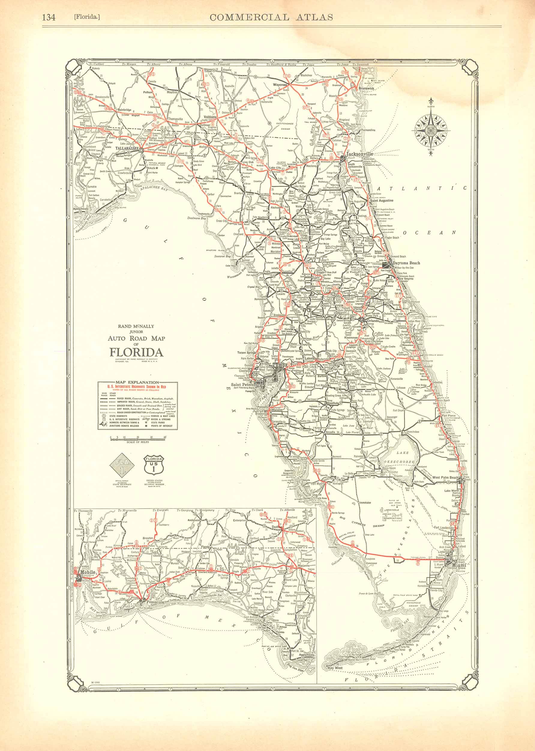 Rand McNally & Company, still a major name in map publishing to this day, began as a small print shop opened in Chicago in 1856 by William H. Rand. The shop originally printed guidebooks and directories. In 1858, Rand hired Andrew McNally who was later to become a partner. Within the next few years, the shop got into the railroad business by starting to print railway tickets and schedules, a key step in the development of the company. The ticket printing led to the publishing of railway guides, and by 1872 Rand McNally and Company had the capacity to publish maps. This map of Florida came from Rand McNally’s Commercial Atlas. A highly successful run of atlases that lasted over a decade. These maps were primarily used by business, because of their accurate listing of railroads in operation as well as tables of statistical information. This map is unique in several ways, their large format makes an impressive display, and offers additional room where many small towns and extra details are included. Additionally a list of every railroad operating in the state in 1932 is included. All railroad routes are shown on the map. This map includes all cities and towns, lakes, rivers, and bodies of water. All topographical features are also included as well as political features such as counties and Native American Indian reservations.