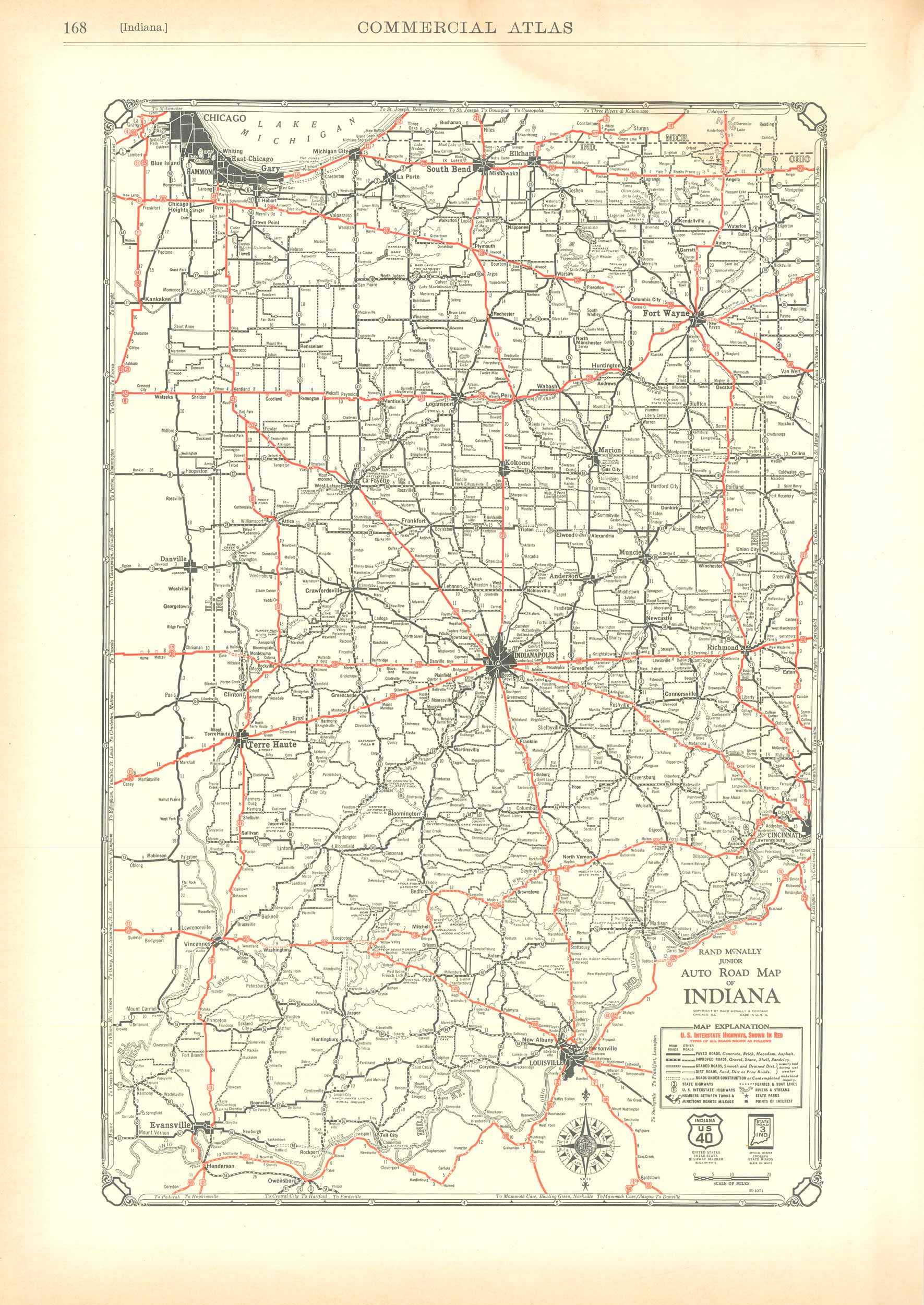 Rand McNally & Company, still a major name in map publishing to this day, began as a small print shop opened in Chicago in 1856 by William H. Rand. The shop originally printed guidebooks and directories. In 1858, Rand hired Andrew McNally who was later to become a partner. Within the next few years, the shop got into the railroad business by starting to print railway tickets and schedules, a key step in the development of the company. The ticket printing led to the publishing of railway guides, and by 1872 Rand McNally and Company had the capacity to publish maps. This map of Indiana came from Rand McNallys Commercial Atlas. A highly successful run of atlases that lasted over a decade. These maps were primarily used by business, because of their accurate listing of railroads in operation as well as tables of statistical information. This map is unique in several ways, their large format makes an impressive display, and offers additional room where many small towns and extra details are included. Additionally a list of every railroad operating in the state in 1932 is included. All railroad routes are shown on the map. This map includes all cities and towns, lakes, rivers, and bodies of water. All topographical features are also included as well as political features such as counties and Native American Indian reservations.